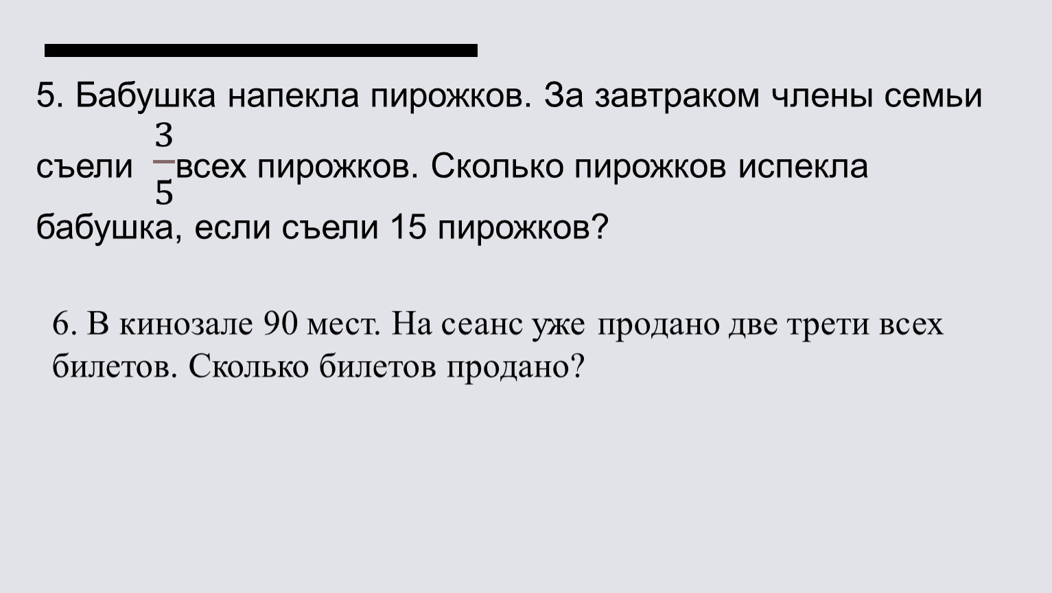 5. Бабушка напекла пирожков. За завтраком члены семьи съели 3 5 3 3 5 5 3 5 всех пирожков. Сколько пирожков испекла бабушка, если съели 15 пирожков?