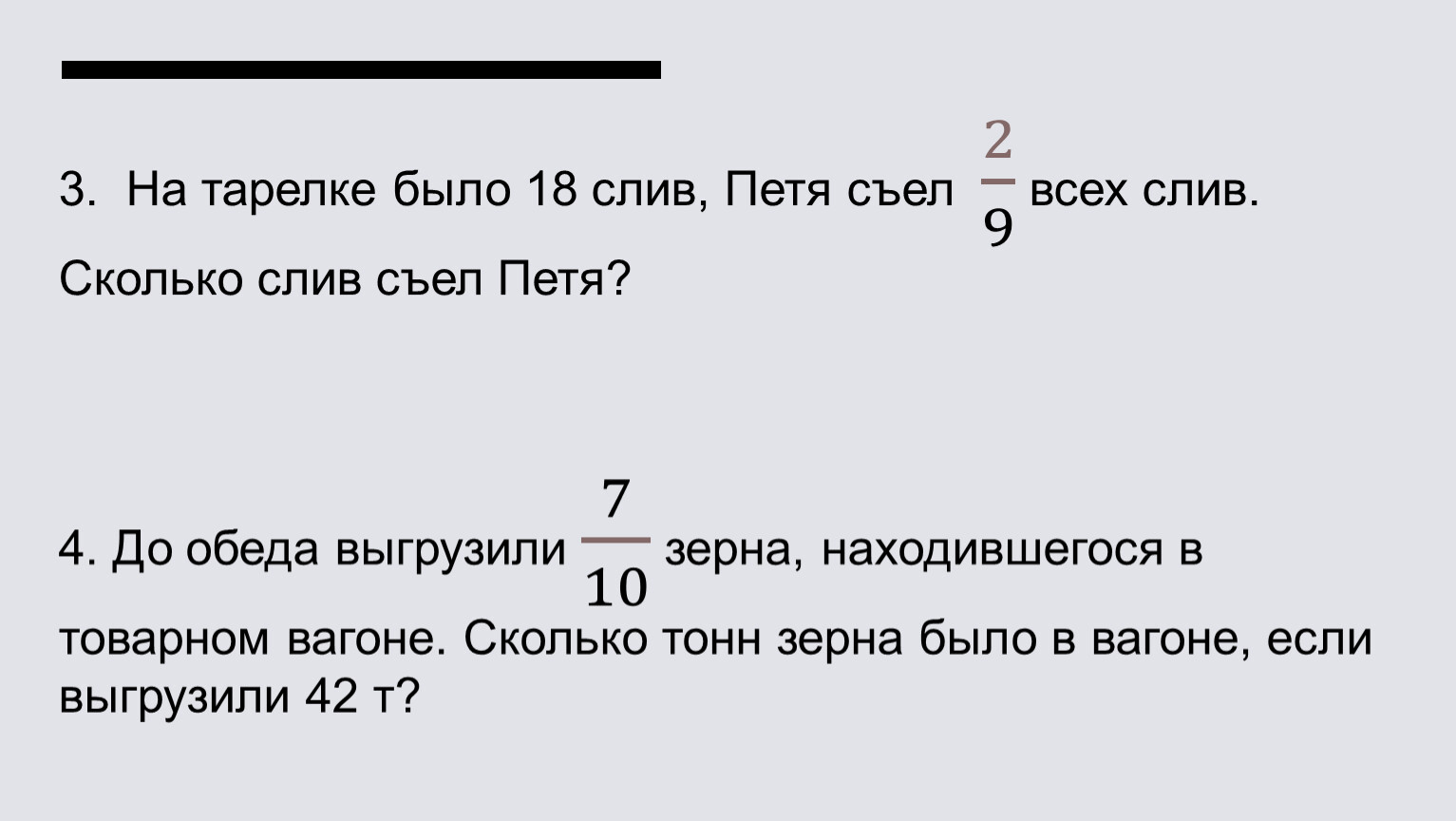 3. На тарелке было 18 слив, Петя съел 2 9 2 2 9 9 2 9 всех слив. Сколько слив съел Петя?