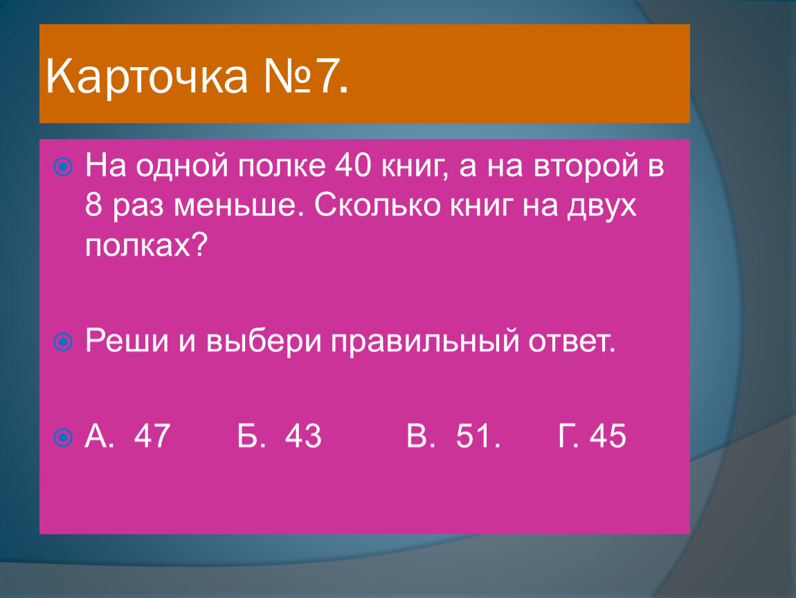На одной полке 40 книг, а на второй в 8 раз меньше. Сколько книг на двух полках?
