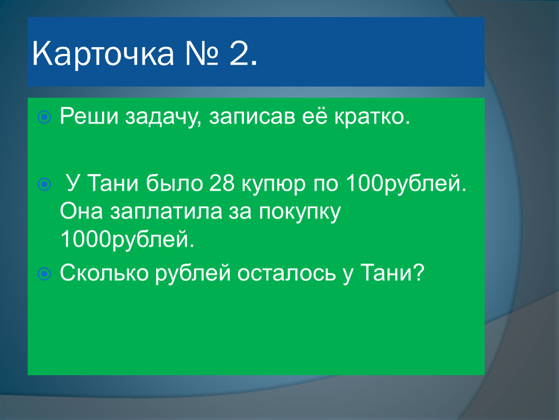 У Тани было 28 купюр по 100рублей. Она заплатила за покупку 1000рублей.