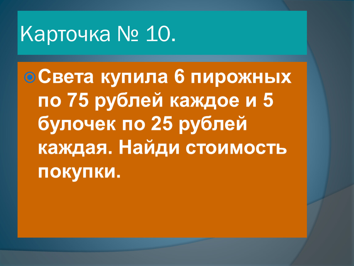 Света купила 6 пирожных по 75 рублей каждое и 5 булочек по 25 рублей каждая. Найди стоимость покупки.