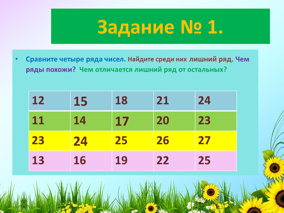 Сравните четыре ряда чисел. Найдите среди них лишний ряд. Чем ряды похожи? Чем отличается лишний ряд от остальных?