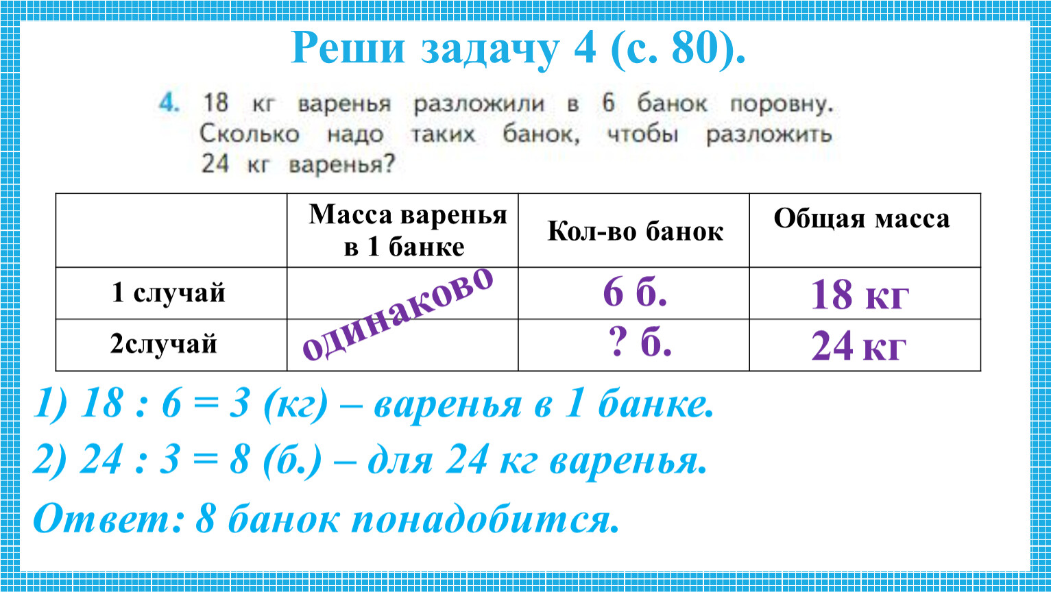 2) 24 : 3 = 8 (б.) – для 24 кг варенья.