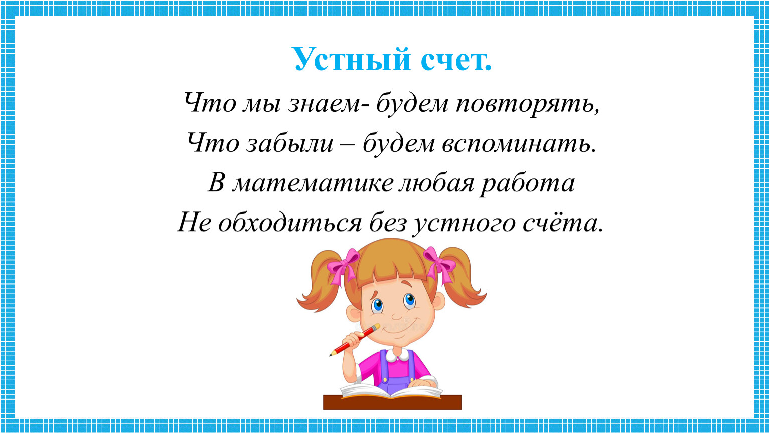 Устный счет. Что мы знаем- будем повторять,Что забыли – будем вспоминать.В математике любая работаНе обходиться без устного счёта.