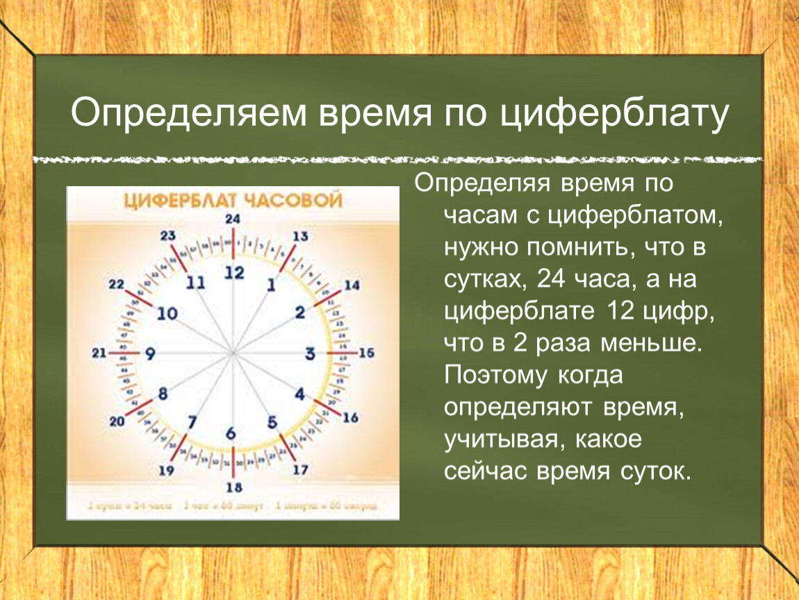 Определяя время по часам с циферблатом, нужно помнить, что в сутках, 24 часа, а на циферблате 12 цифр, что в 2 раза меньше. Поэтому когда определяют время, учитывая, какое сейчас время суток.
