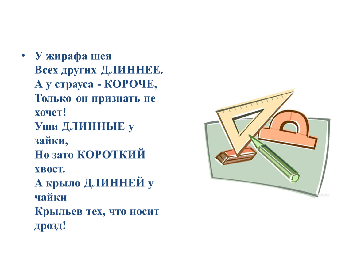 У жирафа шеяВсех других ДЛИННЕЕ.А у страуса - КОРОЧЕ,Только он признать не хочет!Уши ДЛИННЫЕ у зайки,Но зато КОРОТКИЙ хвост.А крыло ДЛИННЕЙ у чайкиКрыльев тех, что носит дрозд!