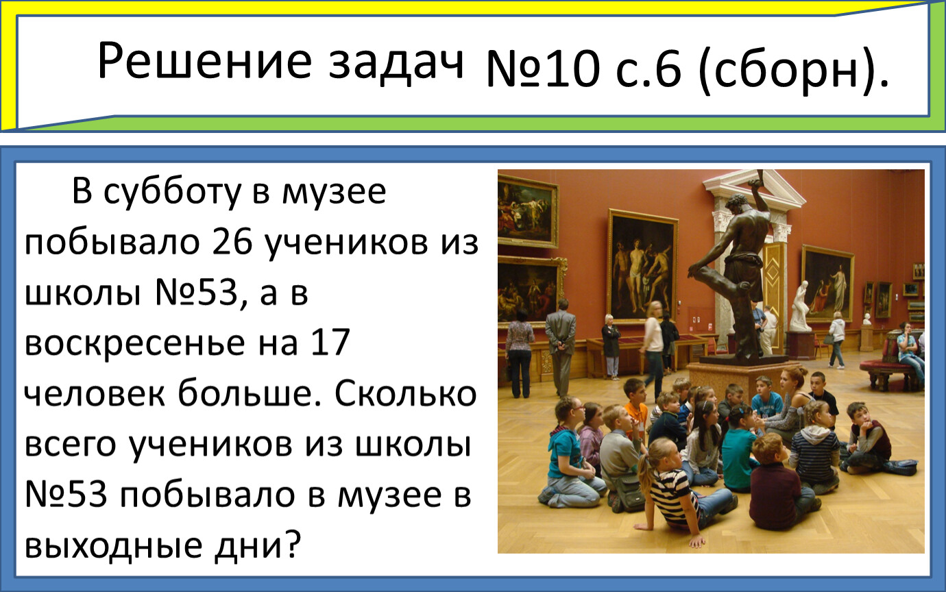 В субботу в музее побывало 26 учеников из школы №53, а в воскресенье на 17 человек больше. Сколько всего учеников из школы №53 побывало в музее в выходные дни?