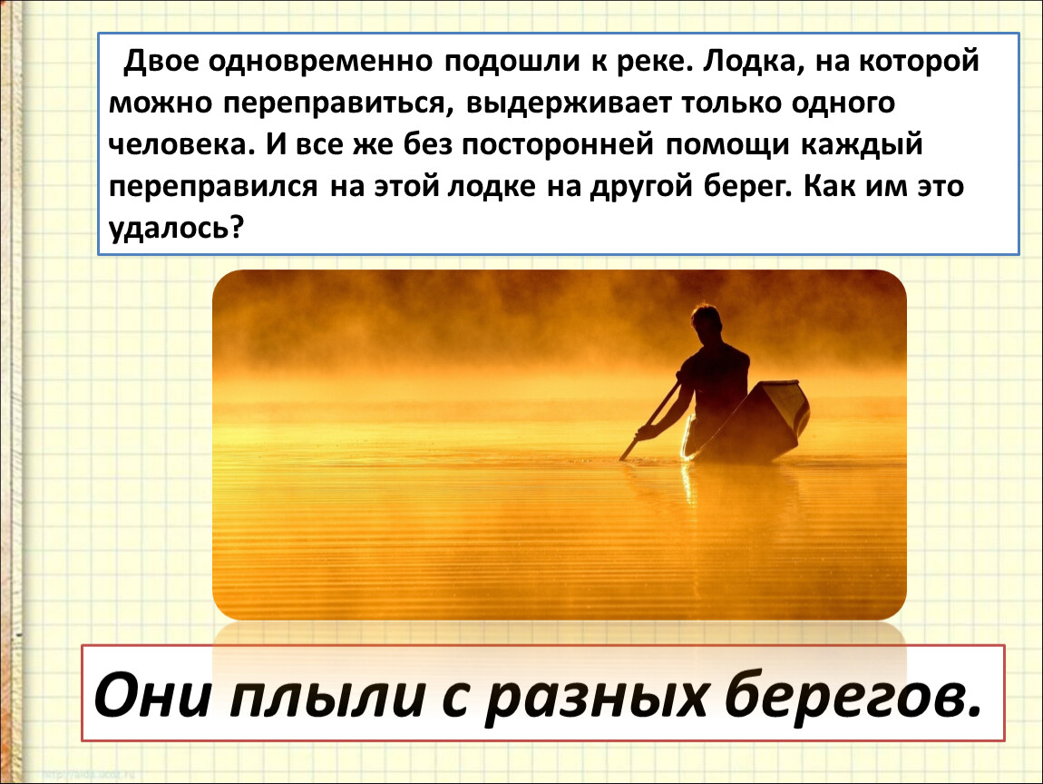 Двое одновременно подошли к реке. Лодка, на которой можно переправиться, выдерживает только одного человека. И все же без посторонней помощи каждый переправился на этой лодке на другой берег. Как им это удалось?