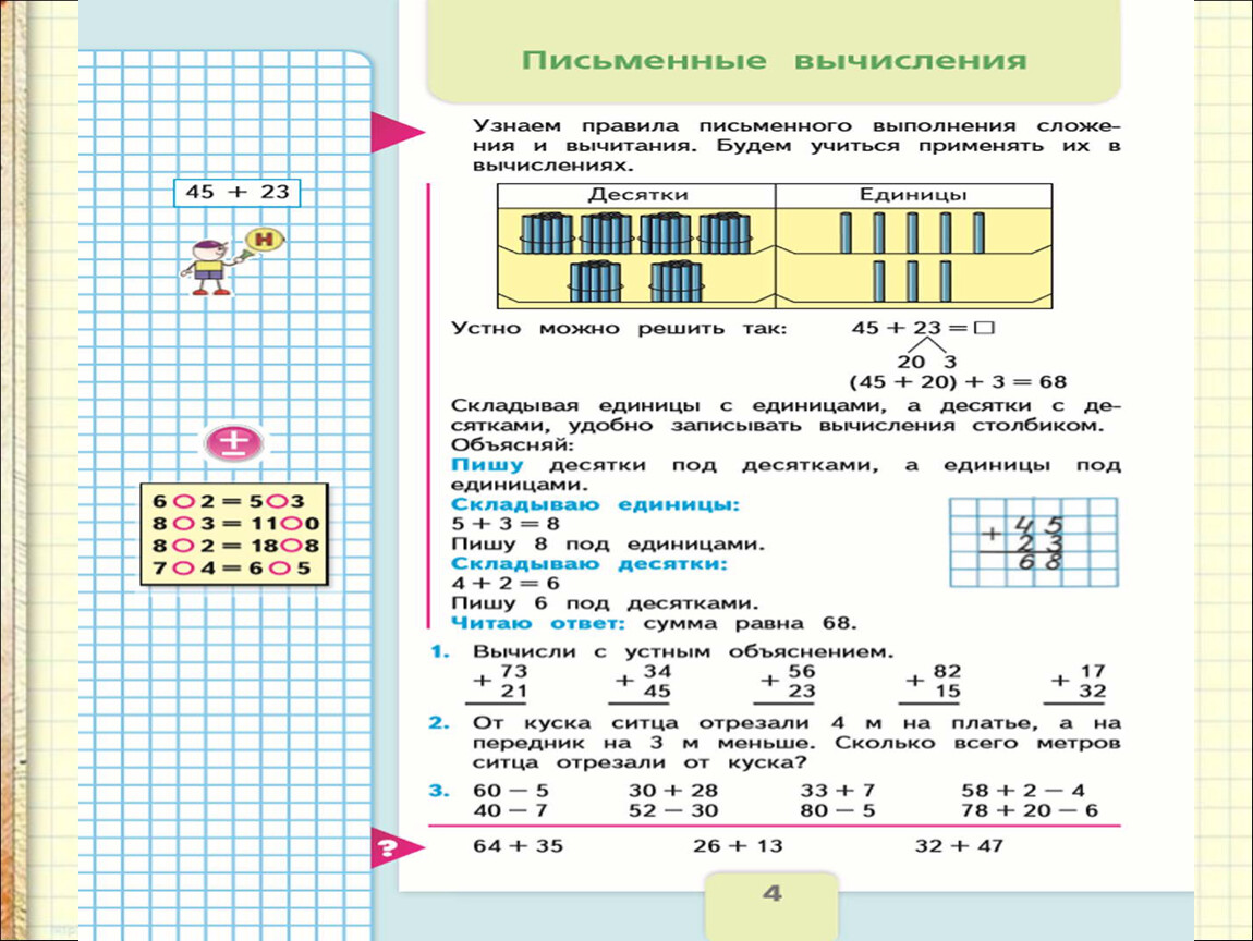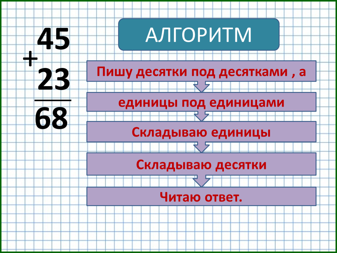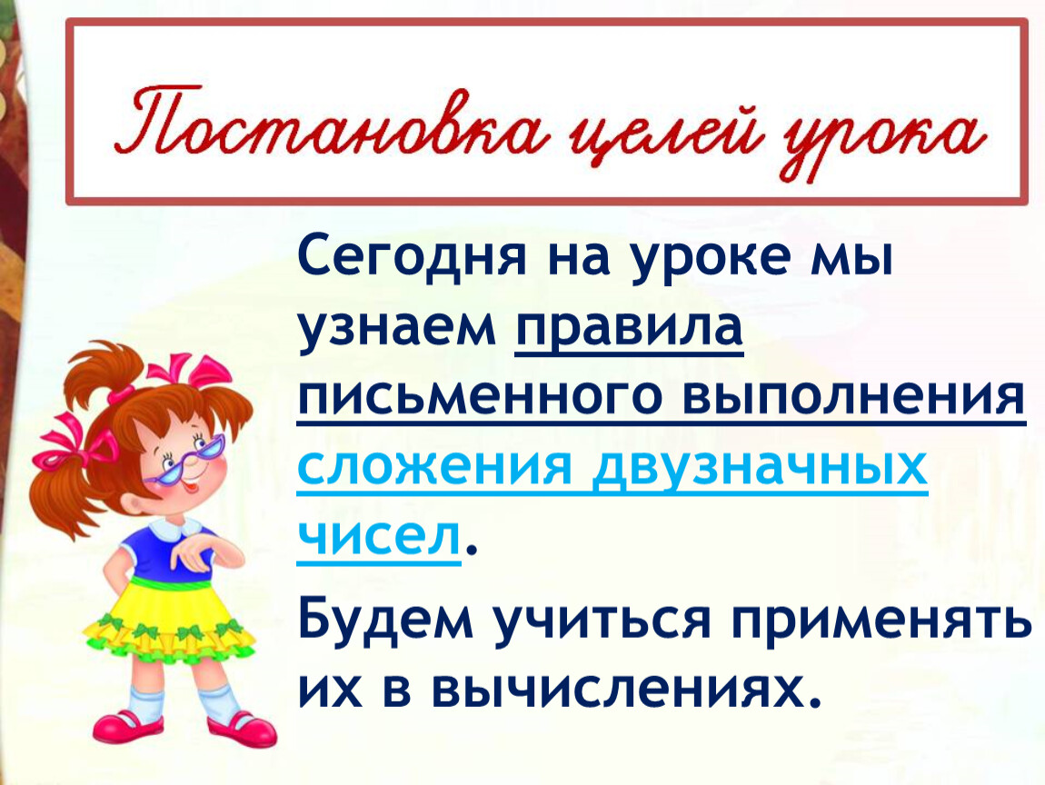 Сегодня на уроке мы узнаем правила письменного выполнения сложения двузначных чисел.