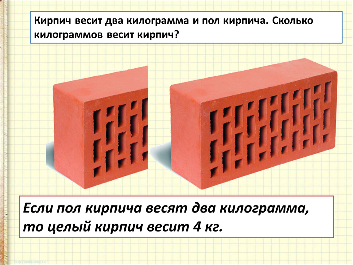 Кирпич весит два килограмма и пол кирпича. Сколько килограммов весит кирпич?