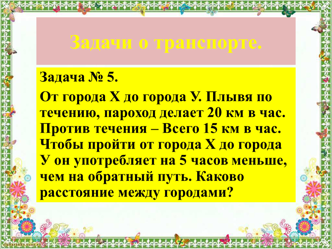 От города Х до города У. Плывя по течению, пароход делает 20 км в час. Против течения – Всего 15 км в час. Чтобы пройти от города Х до города У он употребляет на 5 часов меньше, чем на обратный путь. Каково расстояние между городами?