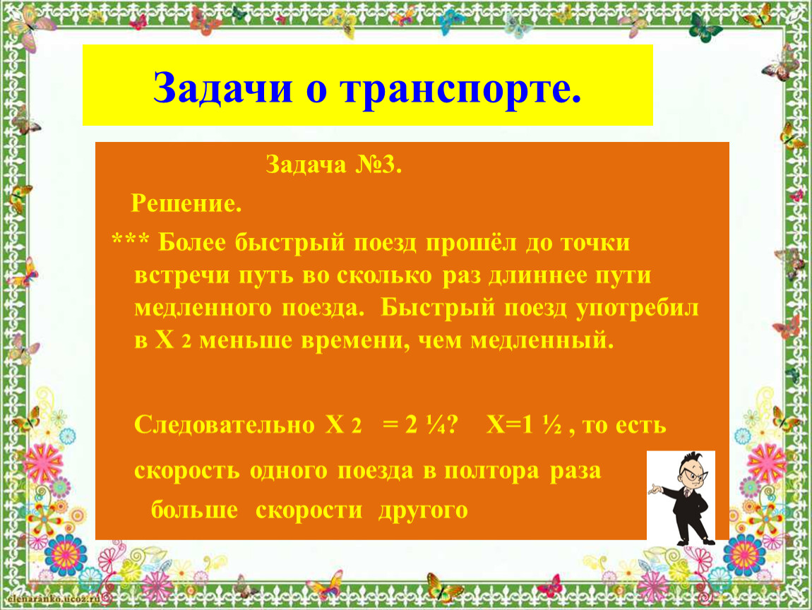 *** Более быстрый поезд прошёл до точки встречи путь во сколько раз длиннее пути медленного поезда. Быстрый поезд употребил в Х 2 меньше времени, чем медленный. Следовательно Х 2 = 2 ¼? Х=1 ½ , то есть скорость одного поезда в полтора раза