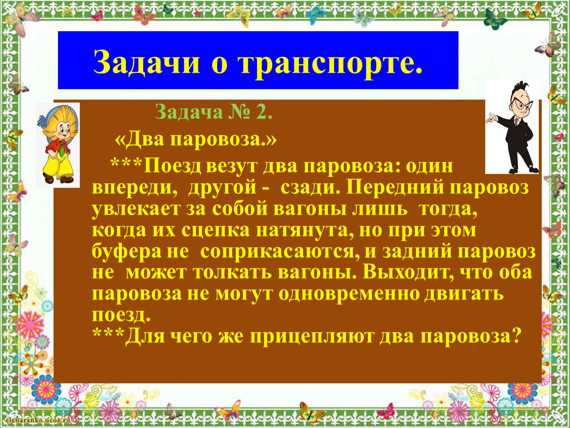 ***Поезд везут два паровоза: один впереди, другой - сзади. Передний паровоз увлекает за собой вагоны лишь тогда, когда их сцепка натянута, но при этом буфера не соприкасаются, и задний паровоз не может толкать вагоны. Выходит, что оба паровоза не могут одновременно двигать поезд. ***Для чего же прицепляют два паровоза?