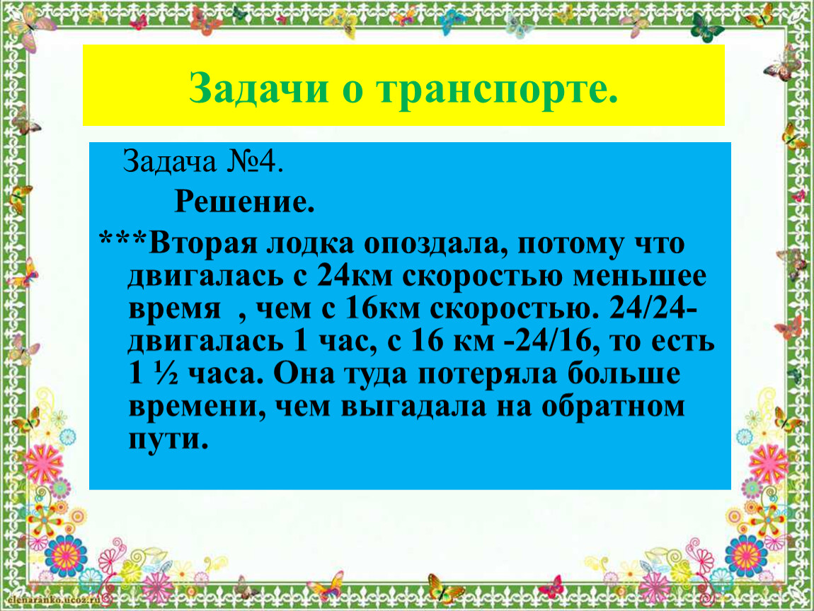 ***Вторая лодка опоздала, потому что двигалась с 24км скоростью меньшее время , чем с 16км скоростью. 24/24-двигалась 1 час, с 16 км -24/16, то есть 1 ½ часа. Она туда потеряла больше времени, чем выгадала на обратном пути.