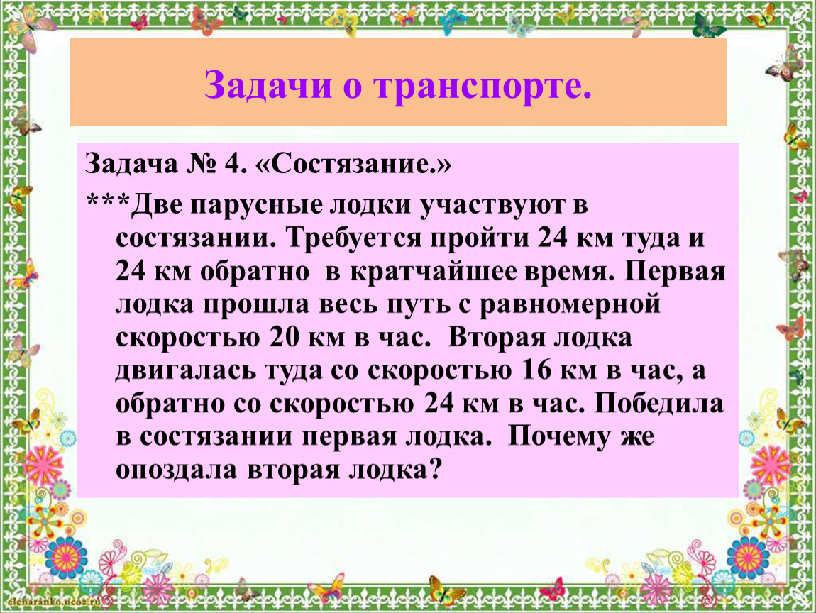 ***Две парусные лодки участвуют в состязании. Требуется пройти 24 км туда и 24 км обратно в кратчайшее время. Первая лодка прошла весь путь с равномерной скоростью 20 км в час. Вторая лодка двигалась туда со скоростью 16 км в час, а обратно со скоростью 24 км в час. Победила в состязании первая лодка. Почему же опоздала вторая лодка?