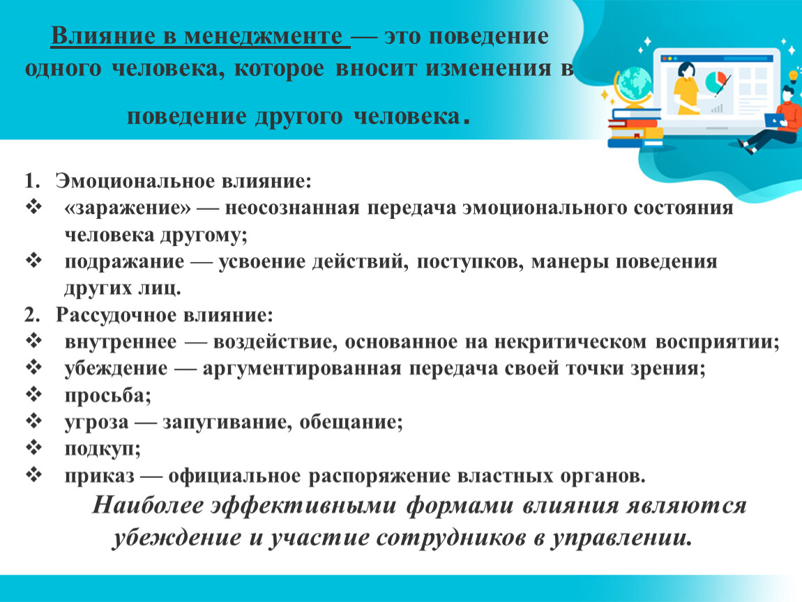 Наиболее эффективными формами влияния являются убеждение и участие сотрудников в управлении.