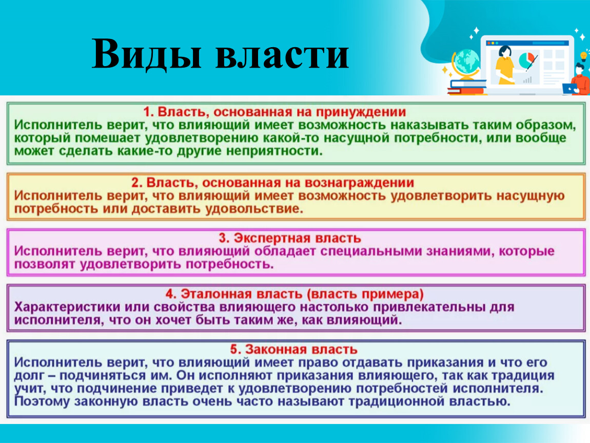 Кооперативная власть: основана на сотрудничестве, совместной работе и разделении власти и ответственности среди всех участников. Руководители, использующие кооперативную власть, стремятся создать атмосферу равноправия, где решения принимаются коллективно и все участники вносят свой вклад.