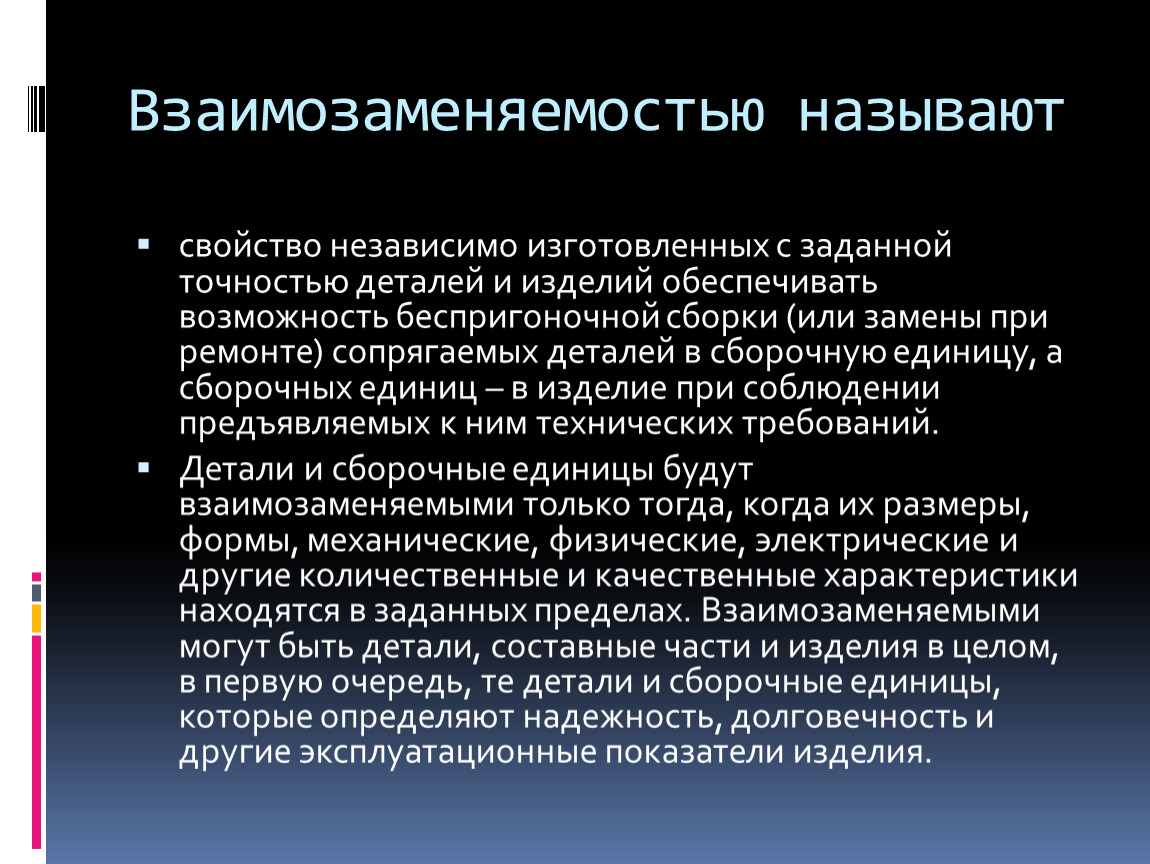 Детали и сборочные единицы будут взаимозаменяемыми только тогда, когда их размеры, формы, механические, физические, электрические и другие количественные и качественные характеристики находятся в заданных пределах. Взаимозаменяемыми могут быть детали, составные части и изделия в целом, в первую очередь, те детали и сборочные единицы, которые определяют надежность, долговечность и другие эксплуатационные показатели изделия.