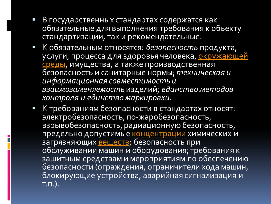 К обязательным относятся: безопасность продукта, услуги, процесса для здоровья человека, окружающей среды, имущества, а также производственная безопасность и санитарные нормы; техническая и информационная совместимость и взаимозаменяемость изделий; единство методов контроля и единство маркировки.