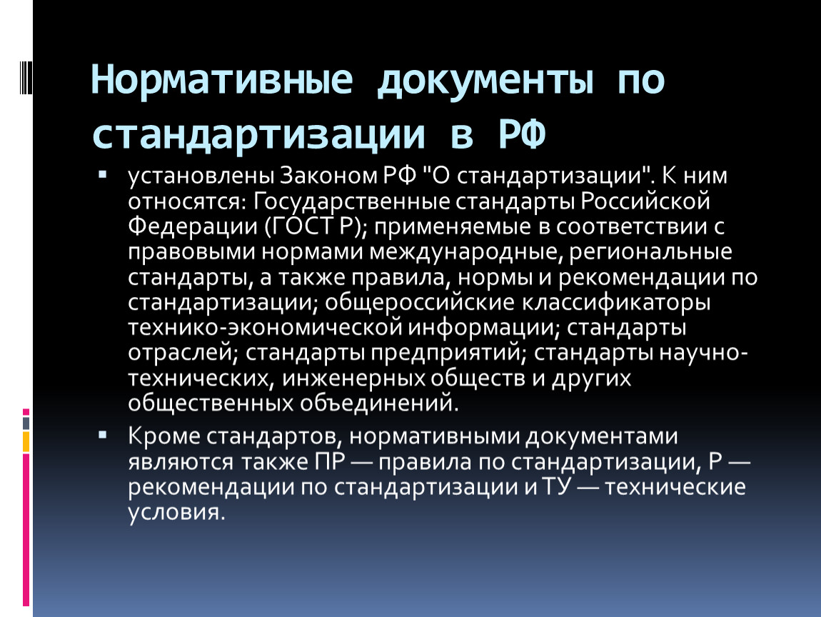 Кроме стандартов, нормативными документами являются также ПР — правила по стандартизации, Ρ — рекомендации по стандартизации и ТУ — технические условия.