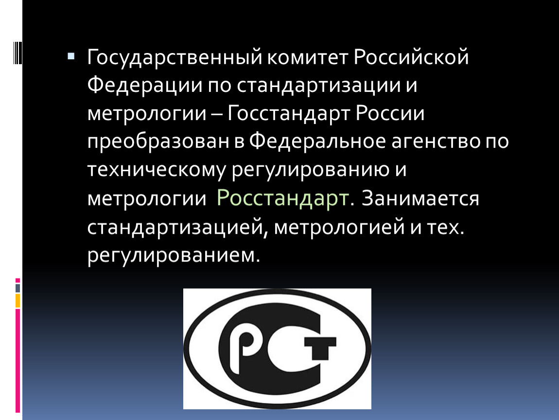 Государственный комитет Российской Федерации по стандартизации и метрологии – Госстандарт России преобразован в Федеральное агенство по техническому регулированию и метрологии Росстандарт. Занимается стандартизацией, метрологией и тех. регулированием.