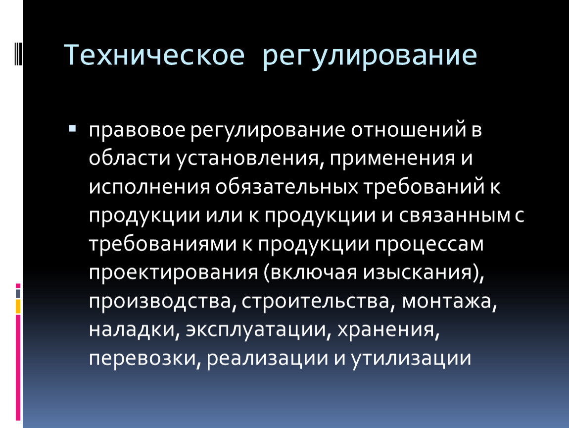 правовое регулирование отношений в области установления, применения и исполнения обязательных требований к продукции или к продукции и связанным с требованиями к продукции процессам проектирования (включая изыскания), производства, строительства, монтажа, наладки, эксплуатации, хранения, перевозки, реализации и утилизации