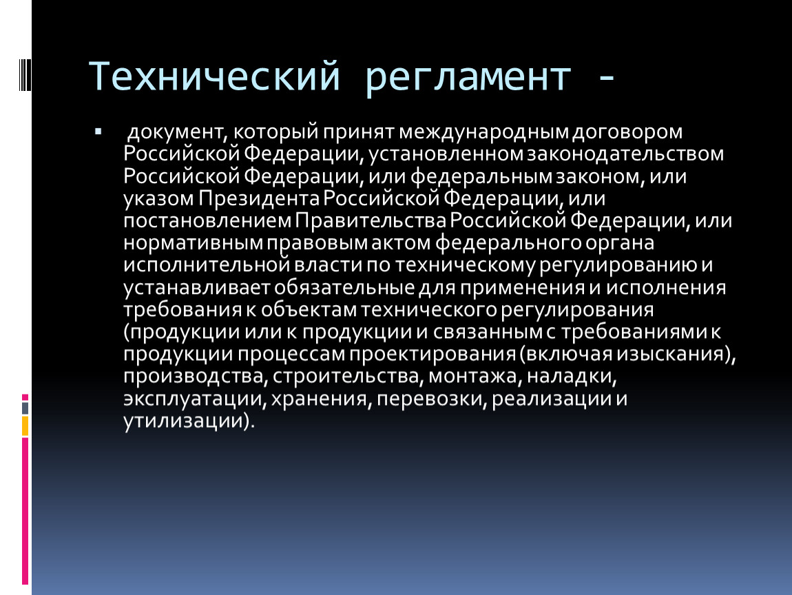 документ, который принят международным договором Российской Федерации, установленном законодательством Российской Федерации, или федеральным законом, или указом Президента Российской Федерации, или постановлением Правительства Российской Федерации, или нормативным правовым актом федерального органа исполнительной власти по техническому регулированию и устанавливает обязательные для применения и исполнения требования к объектам технического регулирования (продукции или к продукции и связанным с требованиями к продукции процессам проектирования (включая изыскания), производства, строительства, монтажа, наладки, эксплуатации, хранения, перевозки, реализации и утилизации).