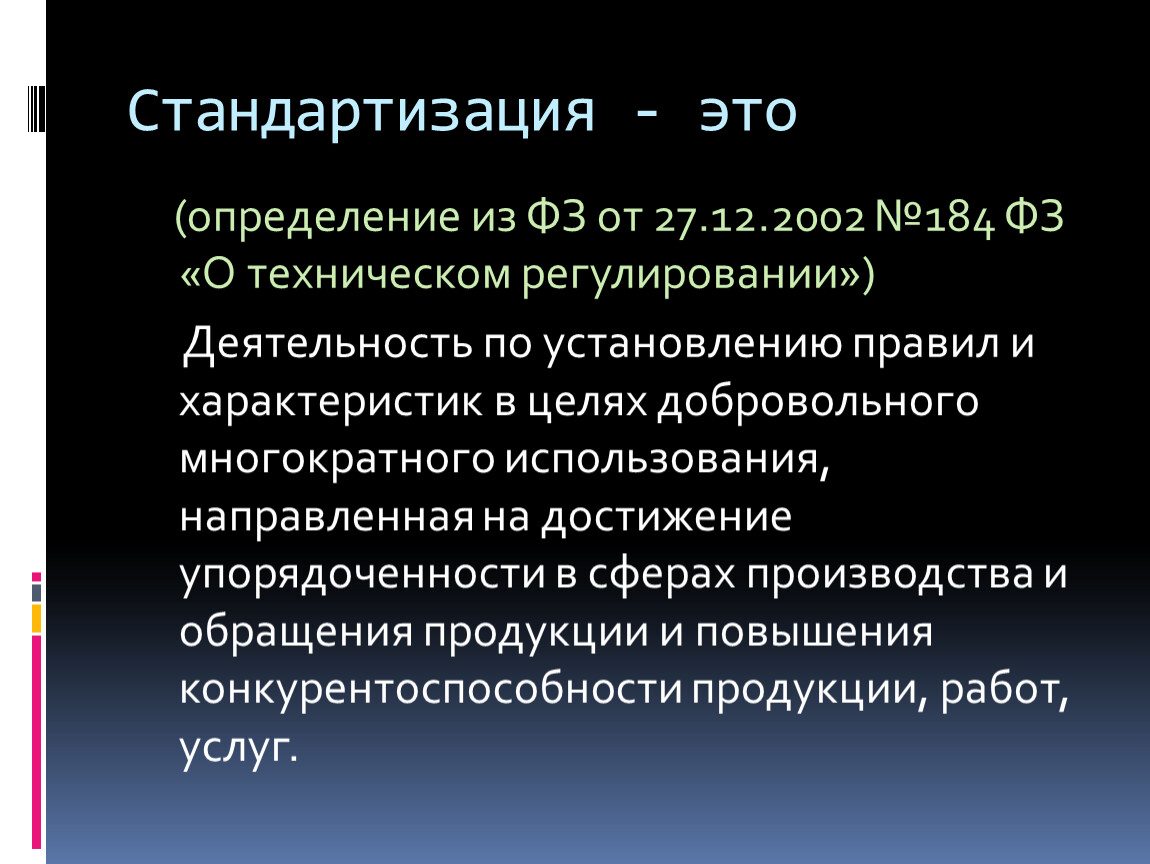 Деятельность по установлению правил и характеристик в целях добровольного многократного использования, направленная на достижение упорядоченности в сферах производства и обращения продукции и повышения конкурентоспособности продукции, работ, услуг.