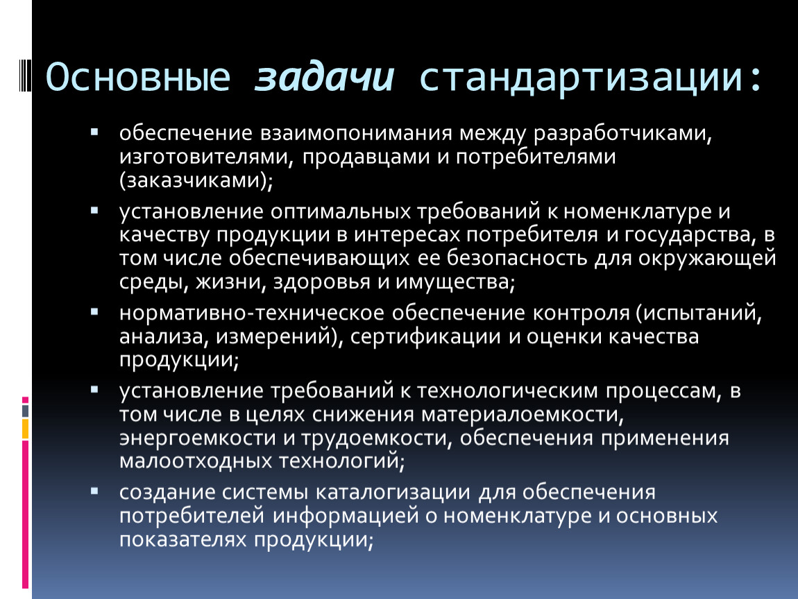 Основные задачи стандартизации: