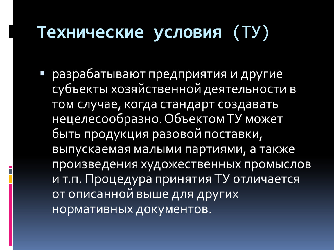 разрабатывают предприятия и другие субъекты хозяйственной деятельности в том случае, когда стандарт создавать нецелесообразно. Объектом ТУ может быть продукция разовой поставки, выпускаемая малыми партиями, а также произведения художественных промыслов и т.п. Процедура принятия ТУ отличается от описанной выше для других нормативных документов.