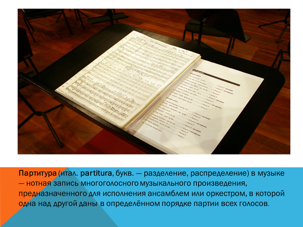 Партитура (итал. partitura, букв. — разделение, распределение) в музыке — нотная запись многоголосного музыкального произведения, предназначенного для исполнения ансамблем или оркестром, в которой одна над другой даны в определённом порядке партии всех голосов.