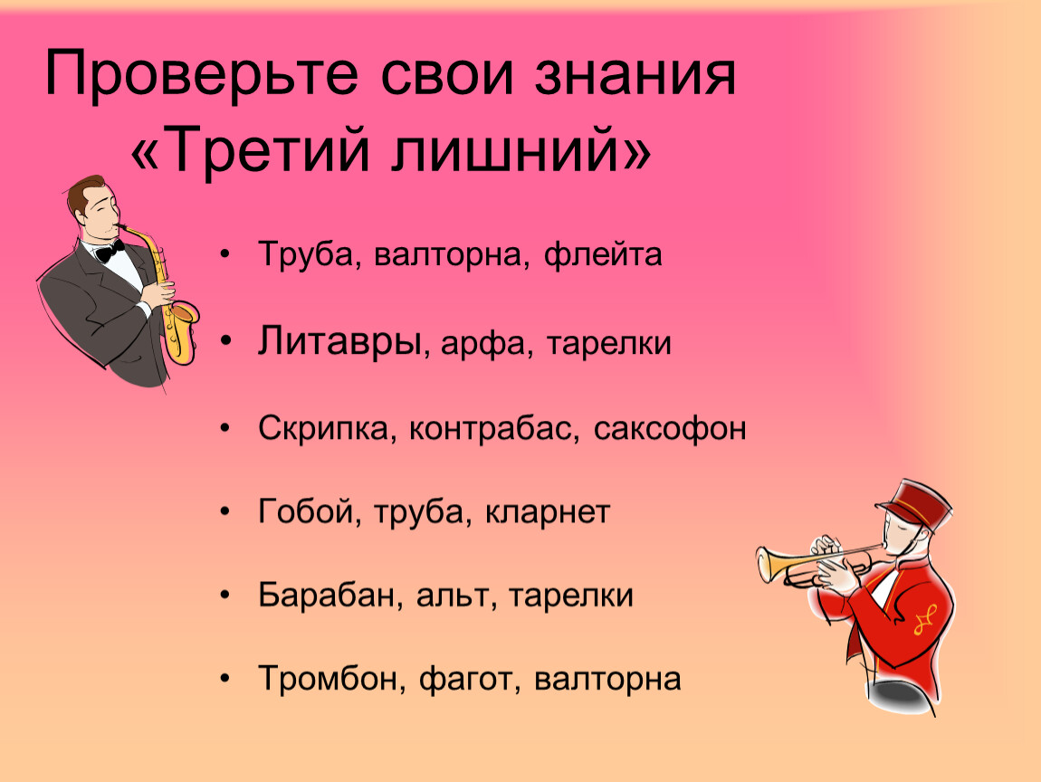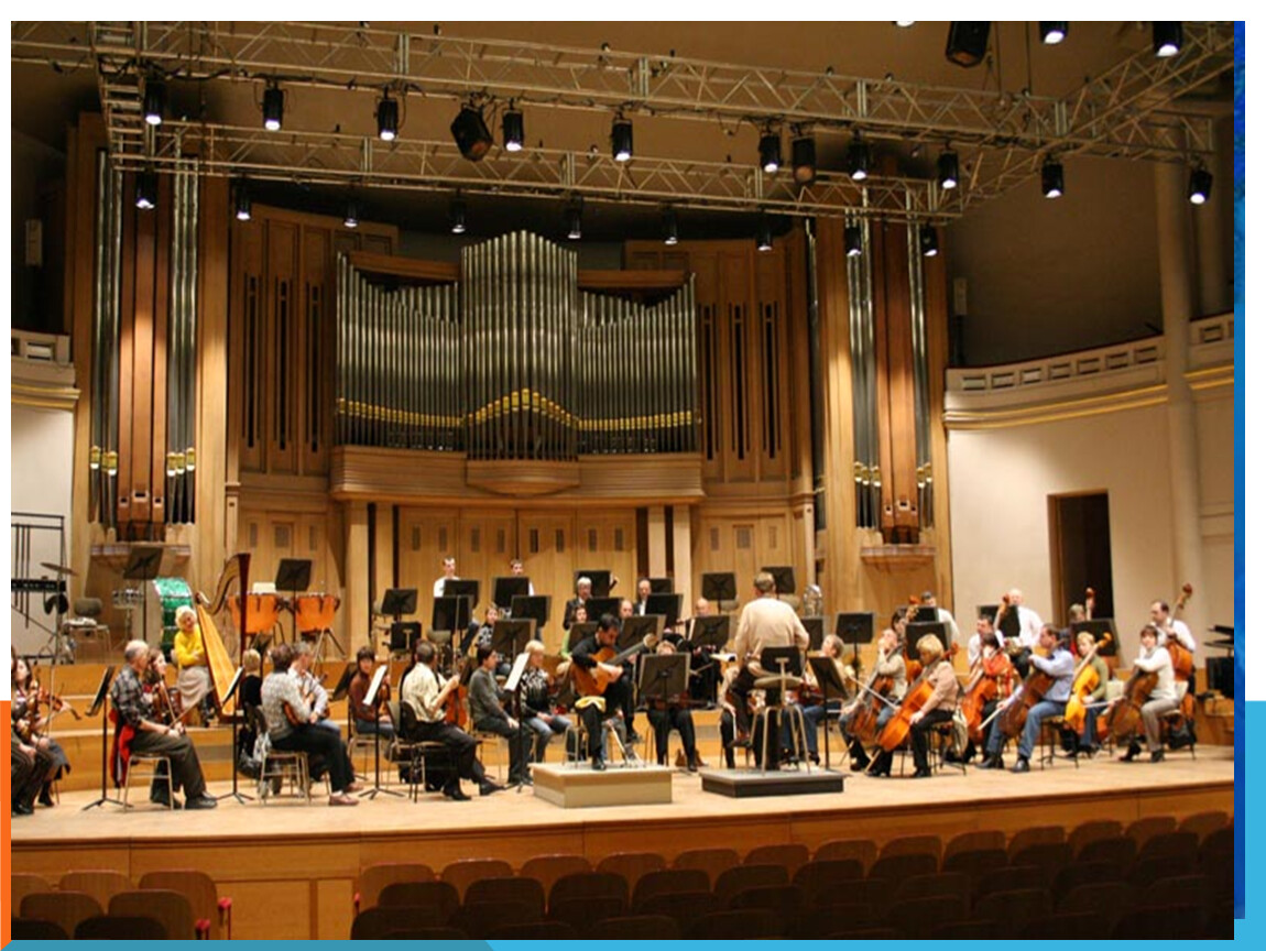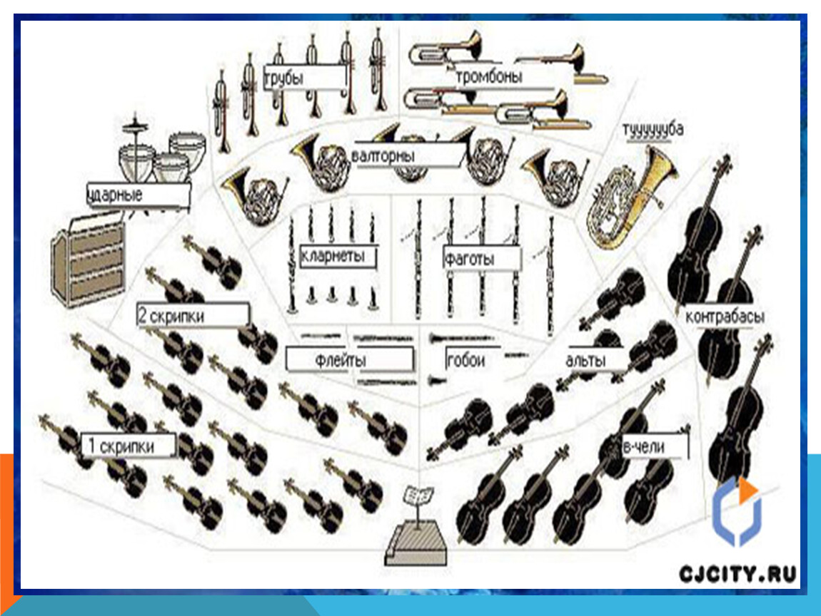3. В состав симфонического оркестра дополнительно включаются: труба, орган, арфа, скрипка, челеста, кларнет, фортепиано.