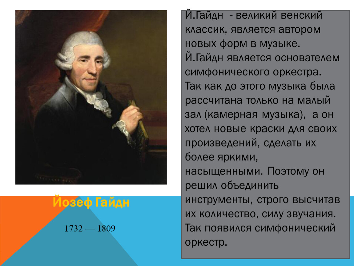 Й.Гайдн - великий венский классик, является автором новых форм в музыке. Й.Гайдн является основателем симфонического оркестра. Так как до этого музыка была рассчитана только на малый зал (камерная музыка), а он хотел новые краски для своих произведений, сделать их более яркими, насыщенными. Поэтому он решил объединить инструменты, строго высчитав их количество, силу звучания. Так появился симфонический оркестр.