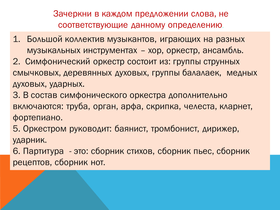 Зачеркни в каждом предложении слова, не соответствующие данному определению.