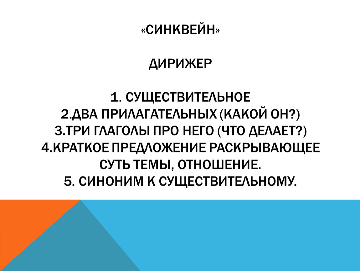 «Синквейн»дирижер1. Существительное 2.ДВА ПРИЛАГАТЕЛЬНЫХ (КАКОЙ ОН?)3.ТРИ ГЛАГОЛЫ ПРО НЕГО (ЧТО ДЕЛАЕТ?)4.КРАТКОЕ ПРЕДЛОЖЕНИЕ РАСКРЫВАЮЩЕЕ СУТЬ ТЕМЫ, ОТНОШЕНИЕ.5. СИНОНИМ К СУЩЕСТВИТЕЛЬНОМУ.
