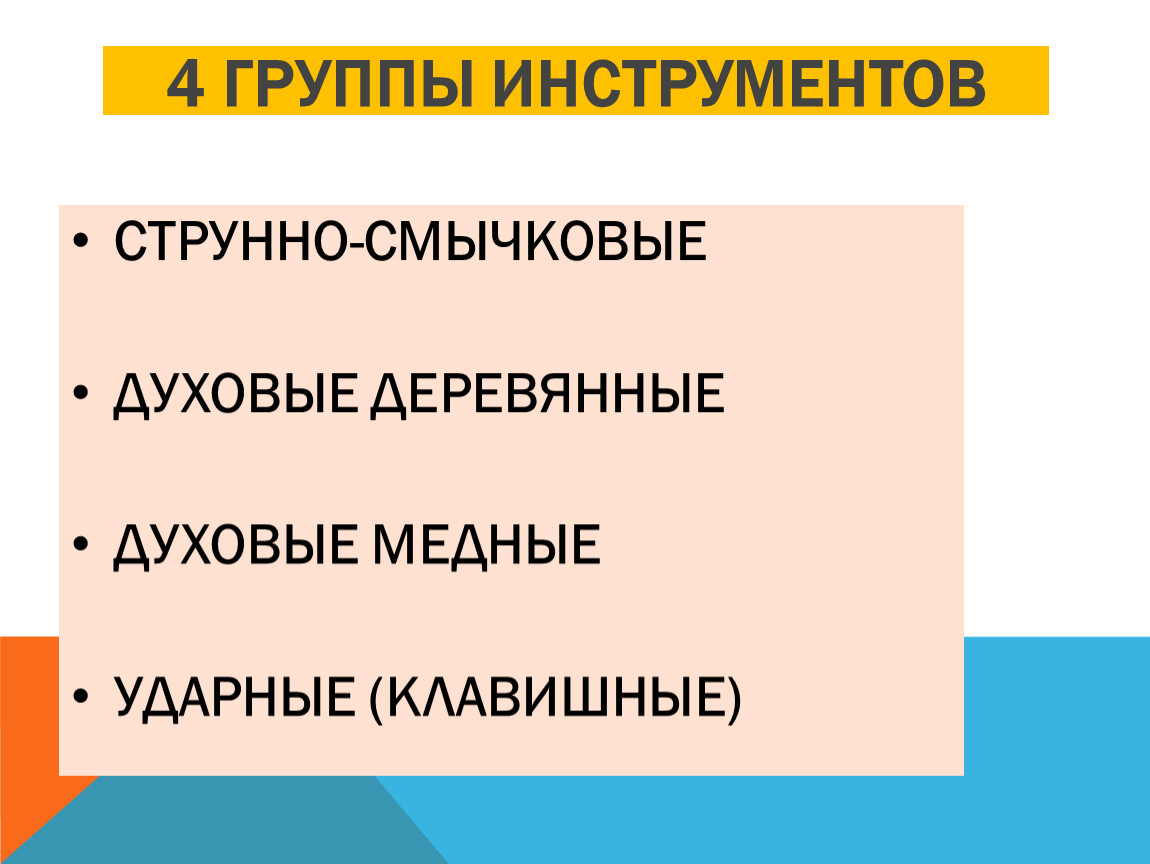 Струнно-смычковые, деревянно –духовые, медно-духовые, ударные
