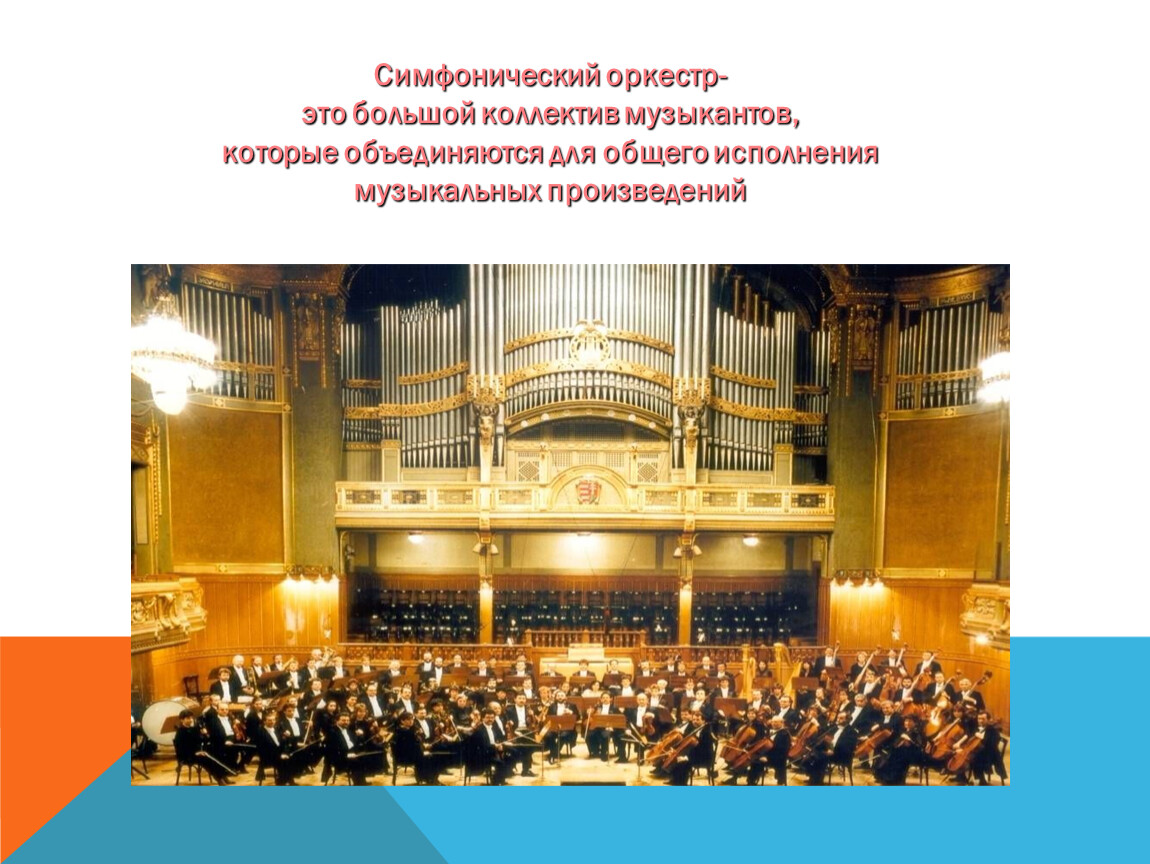 Симфонический оркестр-это большой коллектив музыкантов, которые объединяются для общего исполнения музыкальных произведений