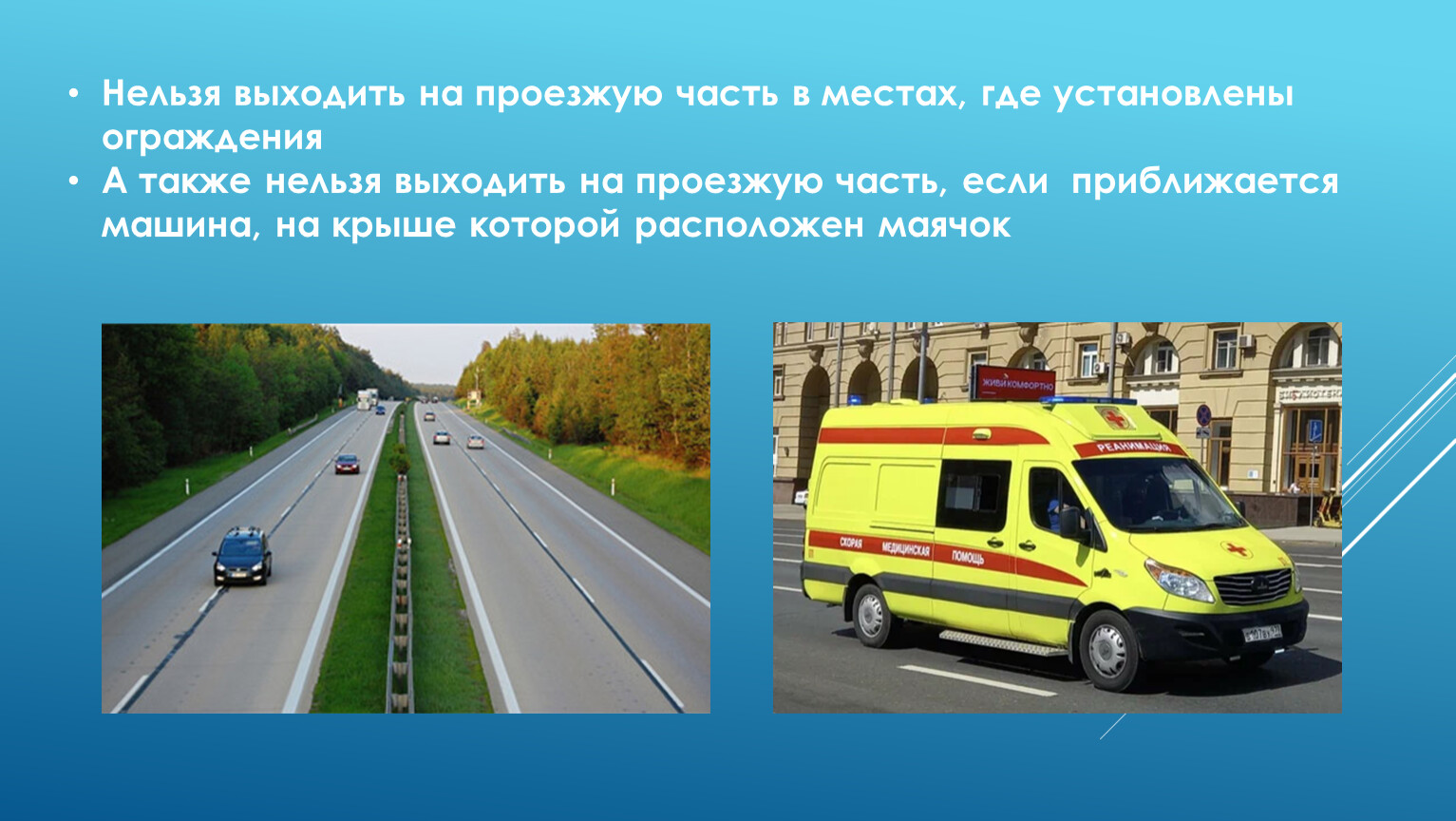А также нельзя выходить на проезжую часть, если приближается машина, на крыше которой расположен маячок