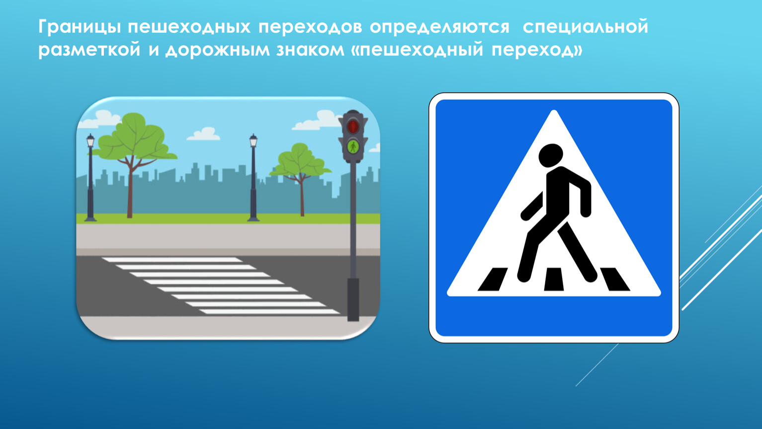 Границы пешеходных переходов определяются специальной разметкой и дорожным знаком «пешеходный переход»