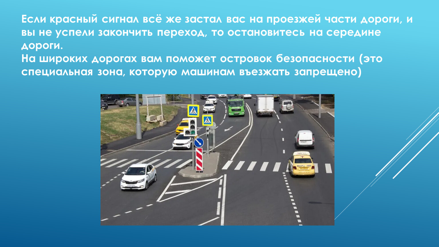 Если красный сигнал всё же застал вас на проезжей части дороги, и вы не успели закончить переход, то остановитесь на середине дороги.