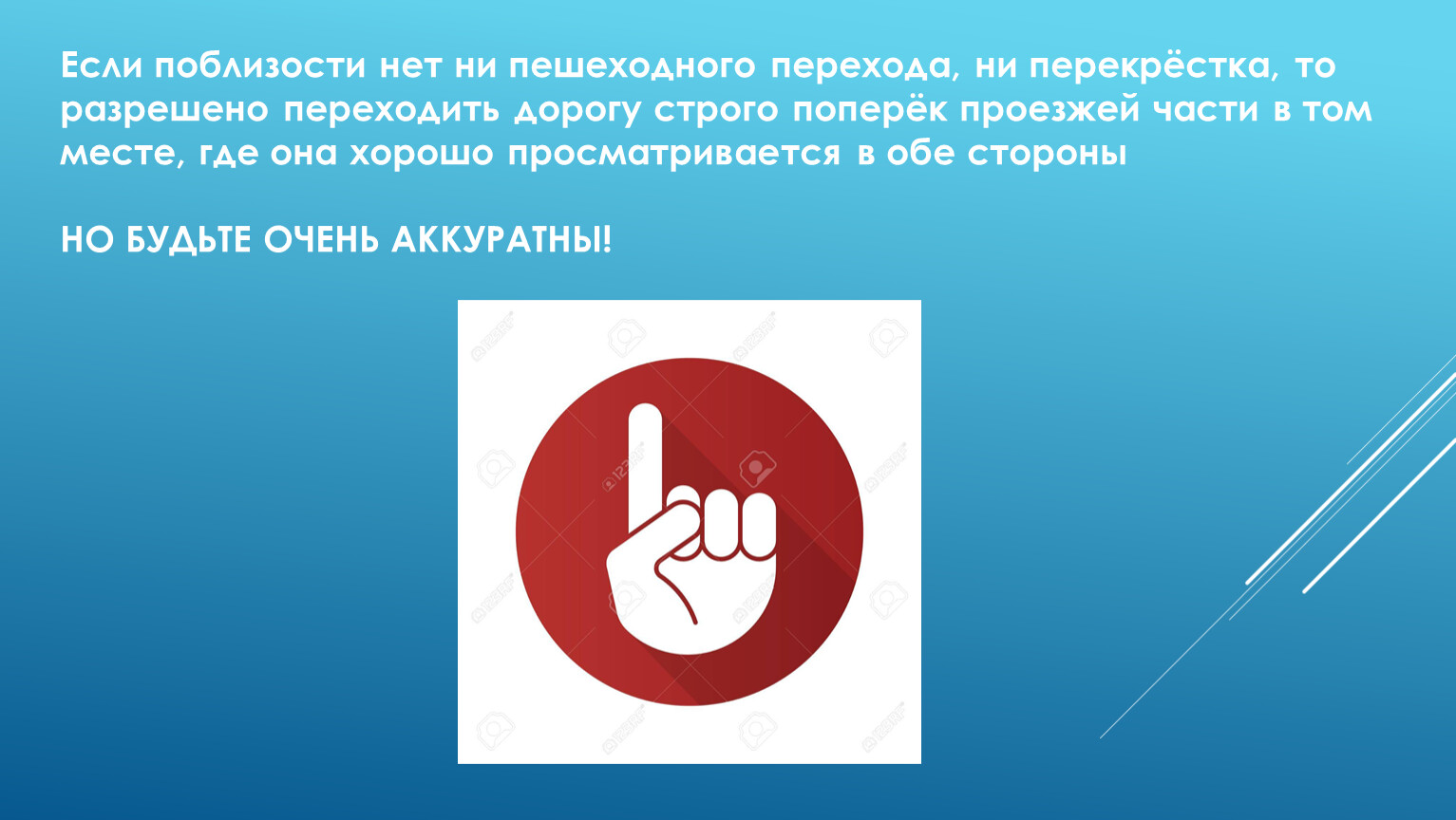Если поблизости нет ни пешеходного перехода, ни перекрёстка, то разрешено переходить дорогу строго поперёк проезжей части в том месте, где она хорошо просматривается в обе стороны