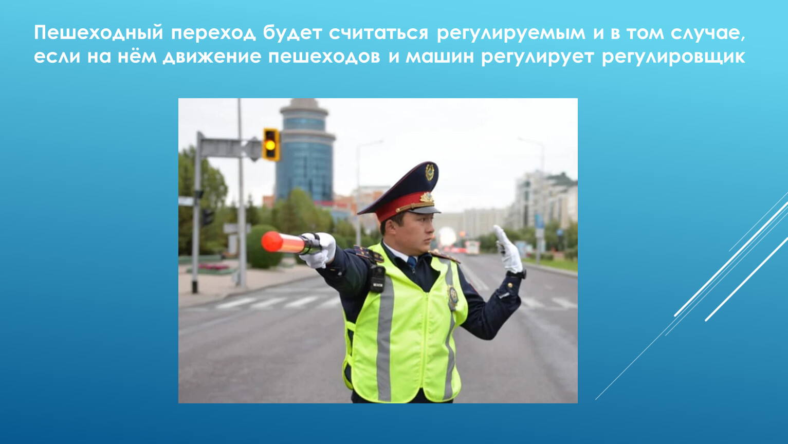 Пешеходный переход будет считаться регулируемым и в том случае, если на нём движение пешеходов и машин регулирует регулировщик