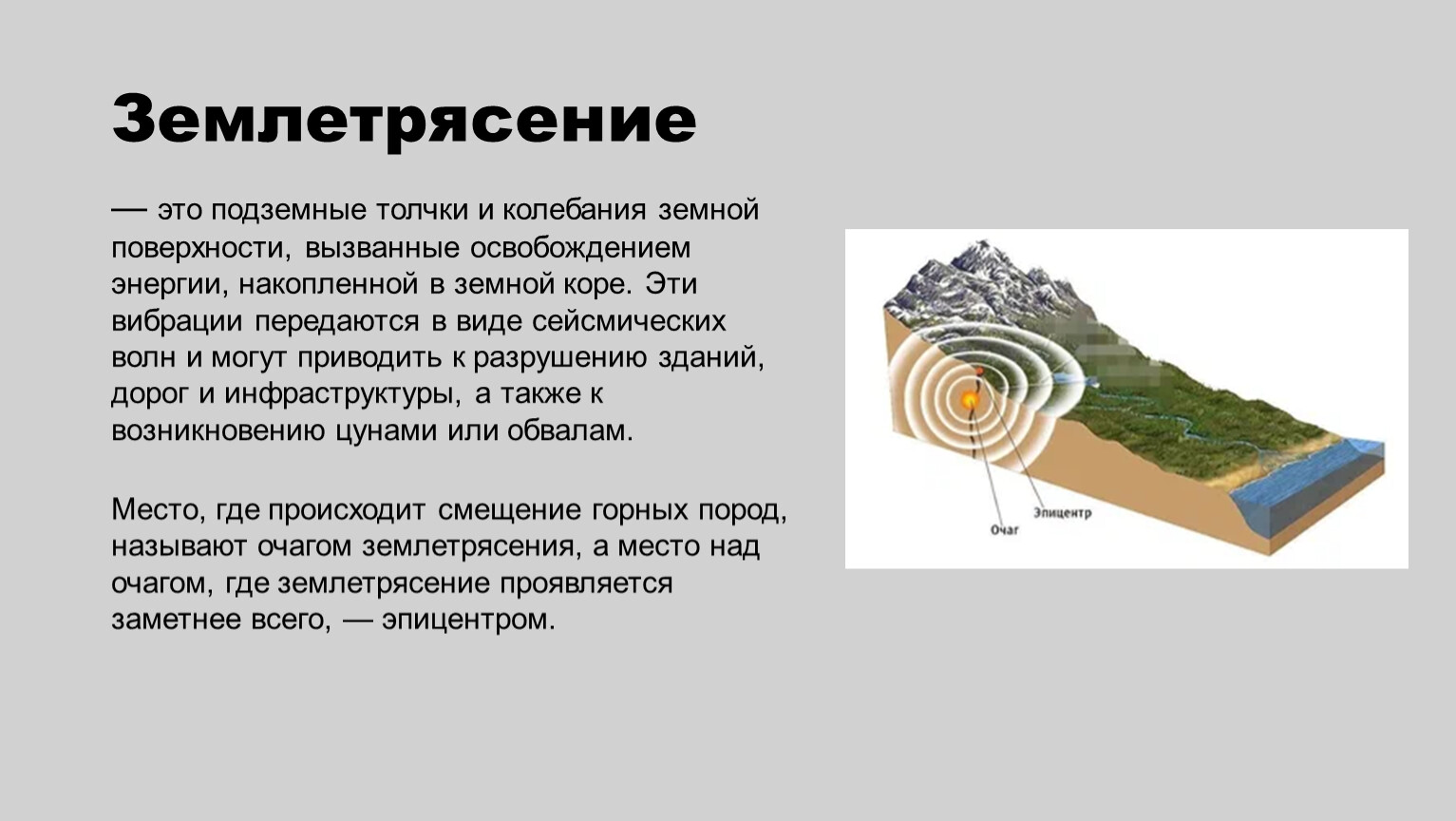 — это подземные толчки и колебания земной поверхности, вызванные освобождением энергии, накопленной в земной коре. Эти вибрации передаются в виде сейсмических волн и могут приводить к разрушению зданий, дорог и инфраструктуры, а также к возникновению цунами или обвалам.
