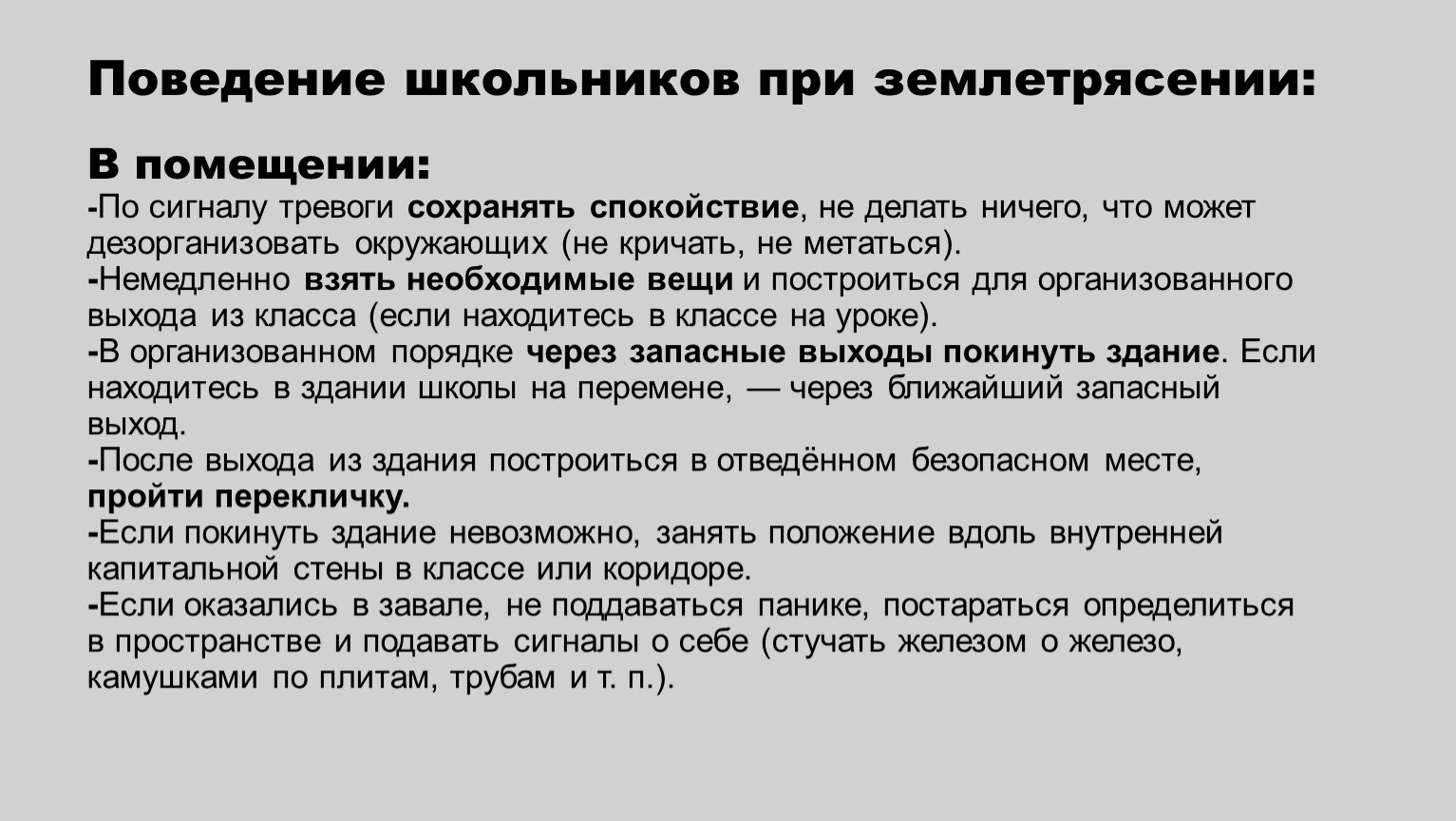 В помещении:-По сигналу тревоги сохранять спокойствие, не делать ничего, что может дезорганизовать окружающих (не кричать, не метаться).-Немедленно взять необходимые вещи и построиться для организованного выхода из класса (если находитесь в классе на уроке).-В организованном порядке через запасные выходы покинуть здание. Если находитесь в здании школы на перемене, — через ближайший запасный выход.-После выхода из здания построиться в отведённом безопасном месте, пройти перекличку.-Если покинуть здание невозможно, занять положение вдоль внутренней капитальной стены в классе или коридоре.-Если оказались в завале, не поддаваться панике, постараться определиться в пространстве и подавать сигналы о себе (стучать железом о железо, камушками по плитам, трубам и т. п.).