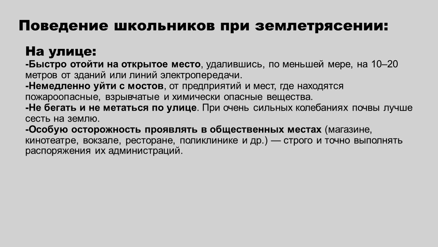 На улице:-Быстро отойти на открытое место, удалившись, по меньшей мере, на 10–20 метров от зданий или линий электропередачи.-Немедленно уйти с мостов, от предприятий и мест, где находятся пожароопасные, взрывчатые и химически опасные вещества.-Не бегать и не метаться по улице. При очень сильных колебаниях почвы лучше сесть на землю.-Особую осторожность проявлять в общественных местах (магазине, кинотеатре, вокзале, ресторане, поликлинике и др.) — строго и точно выполнять распоряжения их администраций.