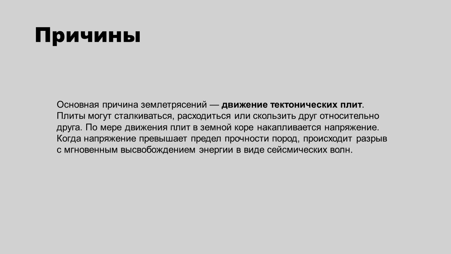 Основная причина землетрясений — движение тектонических плит. Плиты могут сталкиваться, расходиться или скользить друг относительно друга. По мере движения плит в земной коре накапливается напряжение. Когда напряжение превышает предел прочности пород, происходит разрыв с мгновенным высвобождением энергии в виде сейсмических волн.