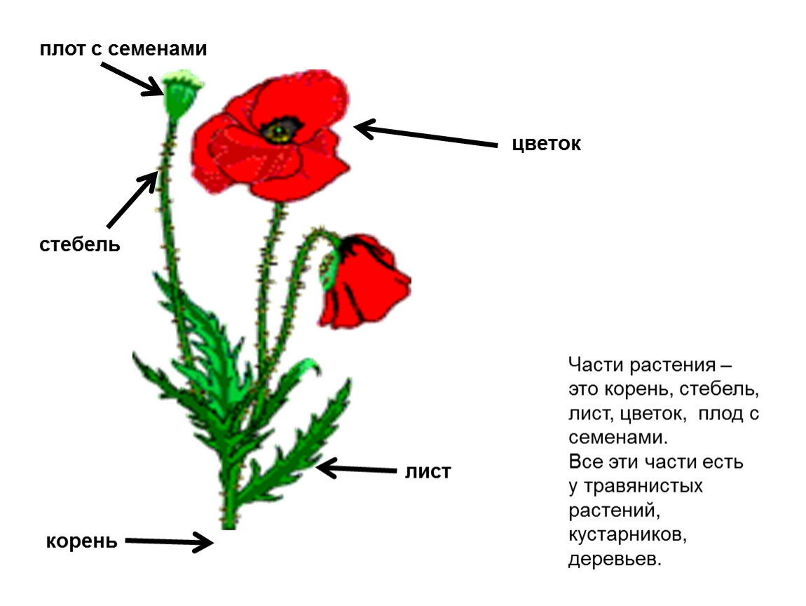 Части растения – это корень, стебель, лист, цветок, плод с семенами. Все эти части есть у травянистых растений, кустарников, деревьев.