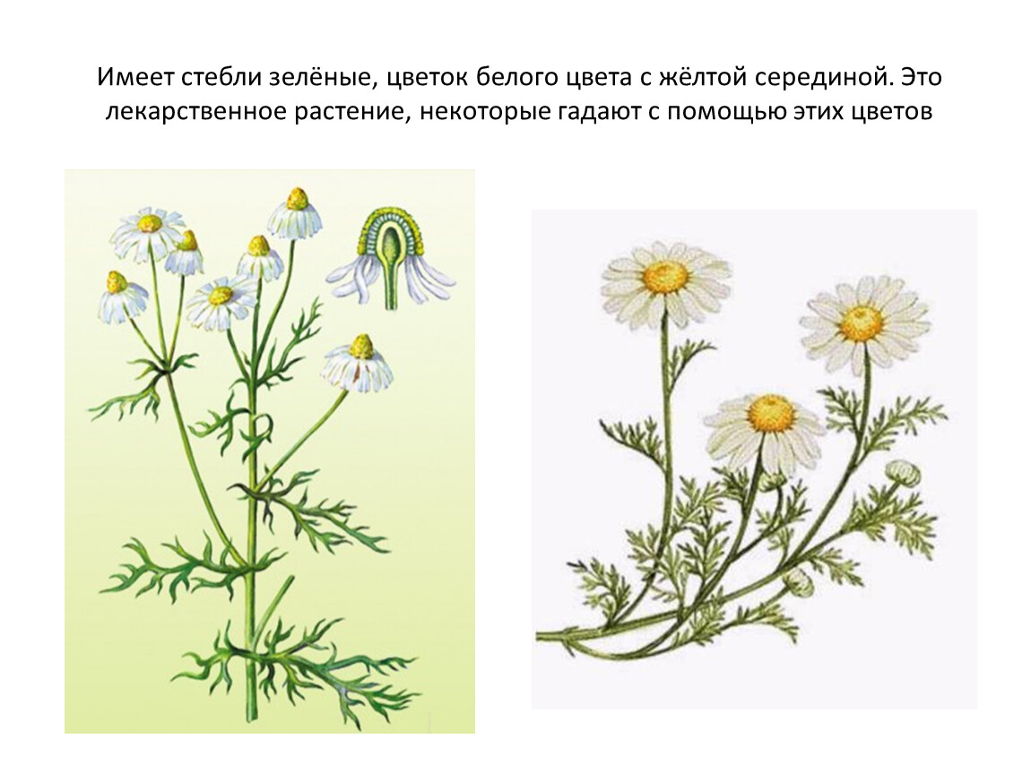 Имеет стебли зелёные, цветок белого цвета с жёлтой серединой. Это лекарственное растение, некоторые гадают с помощью этих цветов