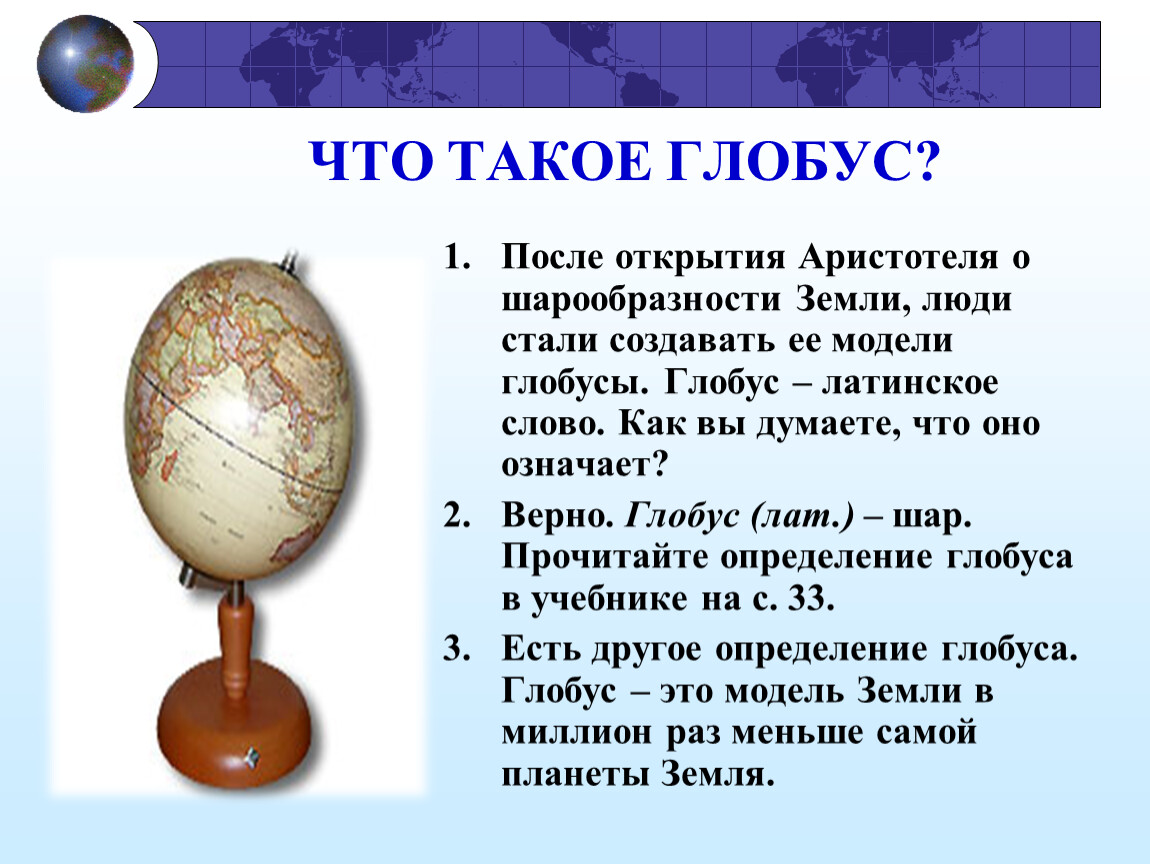 Верно. Глобус (лат.) – шар. Прочитайте определение глобуса в учебнике на с. 33.
