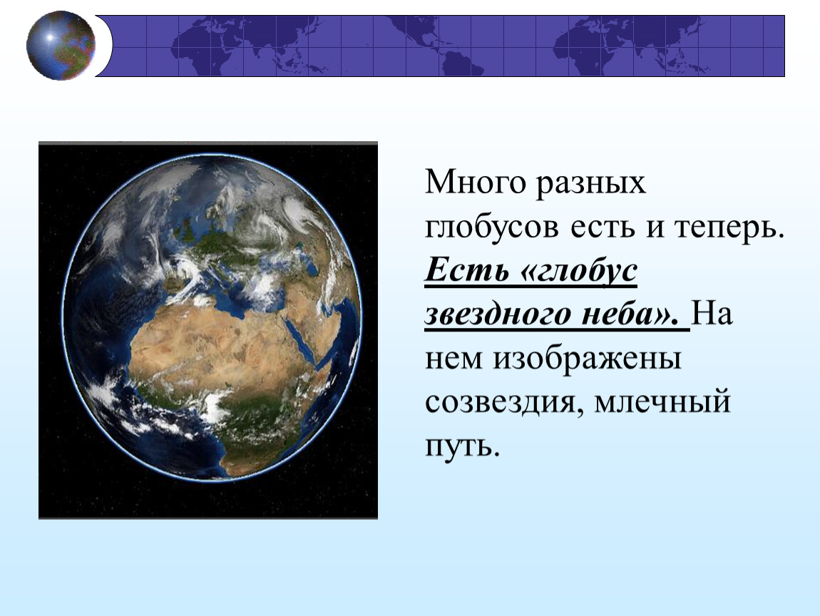 Много разных глобусов есть и теперь. Есть «глобус звездного неба». На нем изображены созвездия, млечный путь.